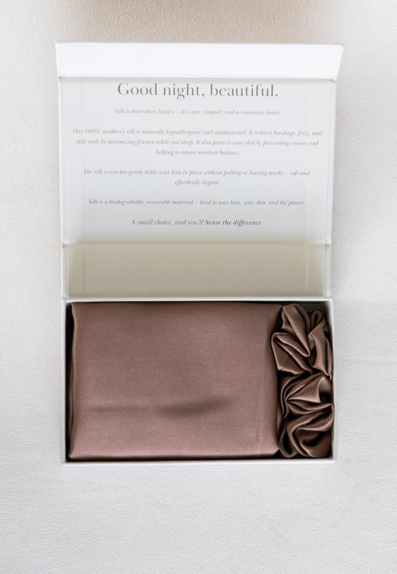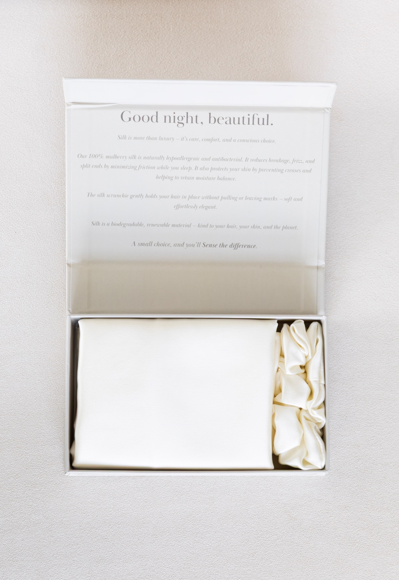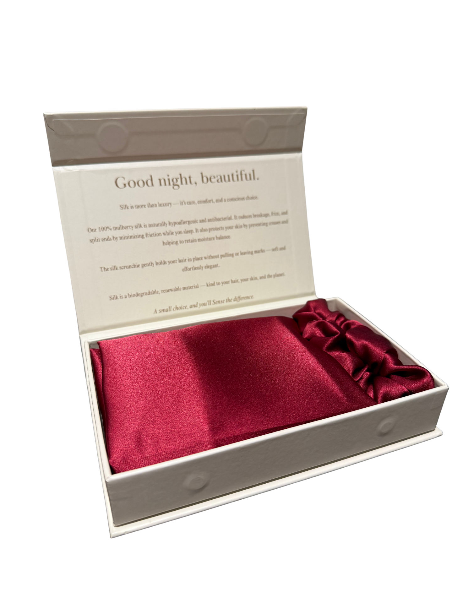 Hellävaraista ylellisyyttä hiuksillesi ja ihollesi. Tämä setti sisältää silkkityynyliinan ja scrunchien, jotka on valmistettu korkealaatuisesta 100 % mulperisilkistä (22 momme). Silkin luonnolliset ominaisuudet tekevät siitä ihanteellisen materiaalin hyvinvointia tukeviin kauneusuniiin.